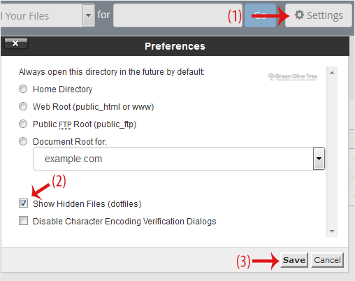 4. If the dot htaccess file does not show, click on Settings in the File Manager. You can find the Settings button on the right side of the top menu. Mark the Show Hidden Files (Dotfiles) option in the new window box and click on Save. Now, the dot htaccess file should be present. If it does not exist, create a new one.
